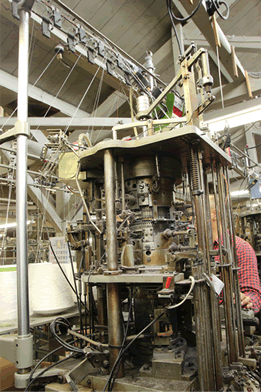 ポリウレタンのゴム糸を編目に流していく装置。 伸縮糸とゴム糸は最もパワーの強い素材を選び、高品質の素材で劣化が少なくフィット感が持続します。