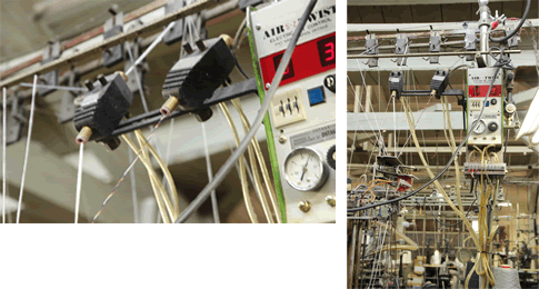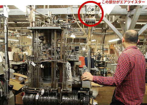 撚糸の工程にエアツイスターを活用。エアツイスターに糸を通す事で、空気の渦で糸を瞬時に撚る事が出来る。糸は撚り合わせる事でより強度が増し、頑丈な生地となります。