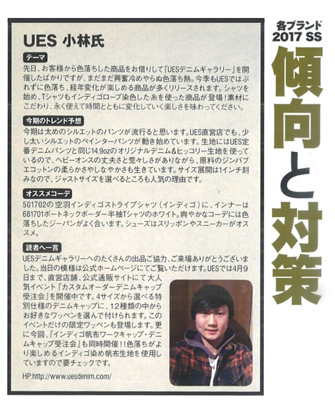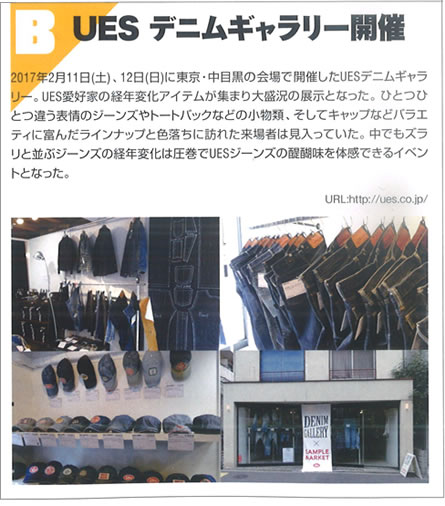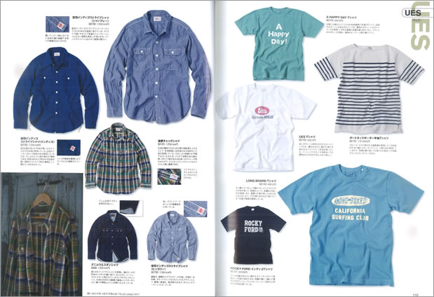 オンラインショップで見る DENIM GALLERY (デニムギャラリー) 紹介ページhttp://ues-jp.pro/denimgallery/index.html A HAPPY DAY! Tシャツ(全5色)http://www.uesdenim.com/shopdetail/000000000784/ ボートネックボーダー半袖Tシャツ ホワイトhttp://www.uesdenim.com/shopdetail/000000000783/ UES Tシャツhttp://www.uesdenim.com/shopdetail/000000000774/ LONG BOARD Tシャツ(全3色)http://www.uesdenim.com/shopdetail/000000000793/ ROCKY FORDインディゴTシャツhttp://www.uesdenim.com/shopdetail/000000000815/ 空羽インディゴストライプシャツhttp://www.uesdenim.com/shopdetail/000000000795/ 追撚チェックシャツ (全2色)http://www.uesdenim.com/shopdetail/000000000780/ ウエスタンシャツhttp://www.uesdenim.com/shopdetail/000000000710/