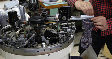 ポリウレタンのゴム糸を編目に流していく装置。 伸縮糸とゴム糸は最もパワーの強い素材を選び、高品質の素材で劣化が少なくフィット感が持続します。